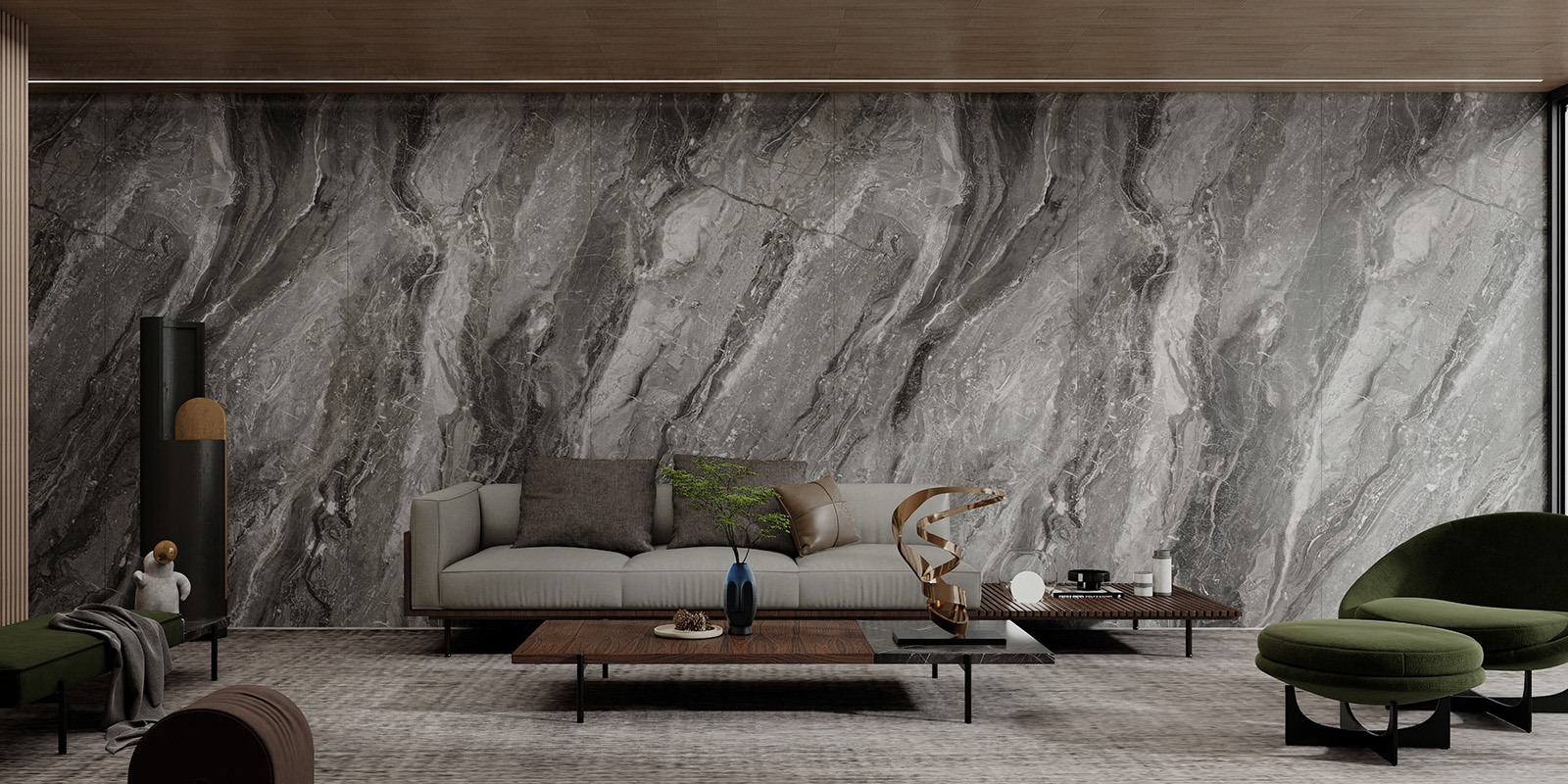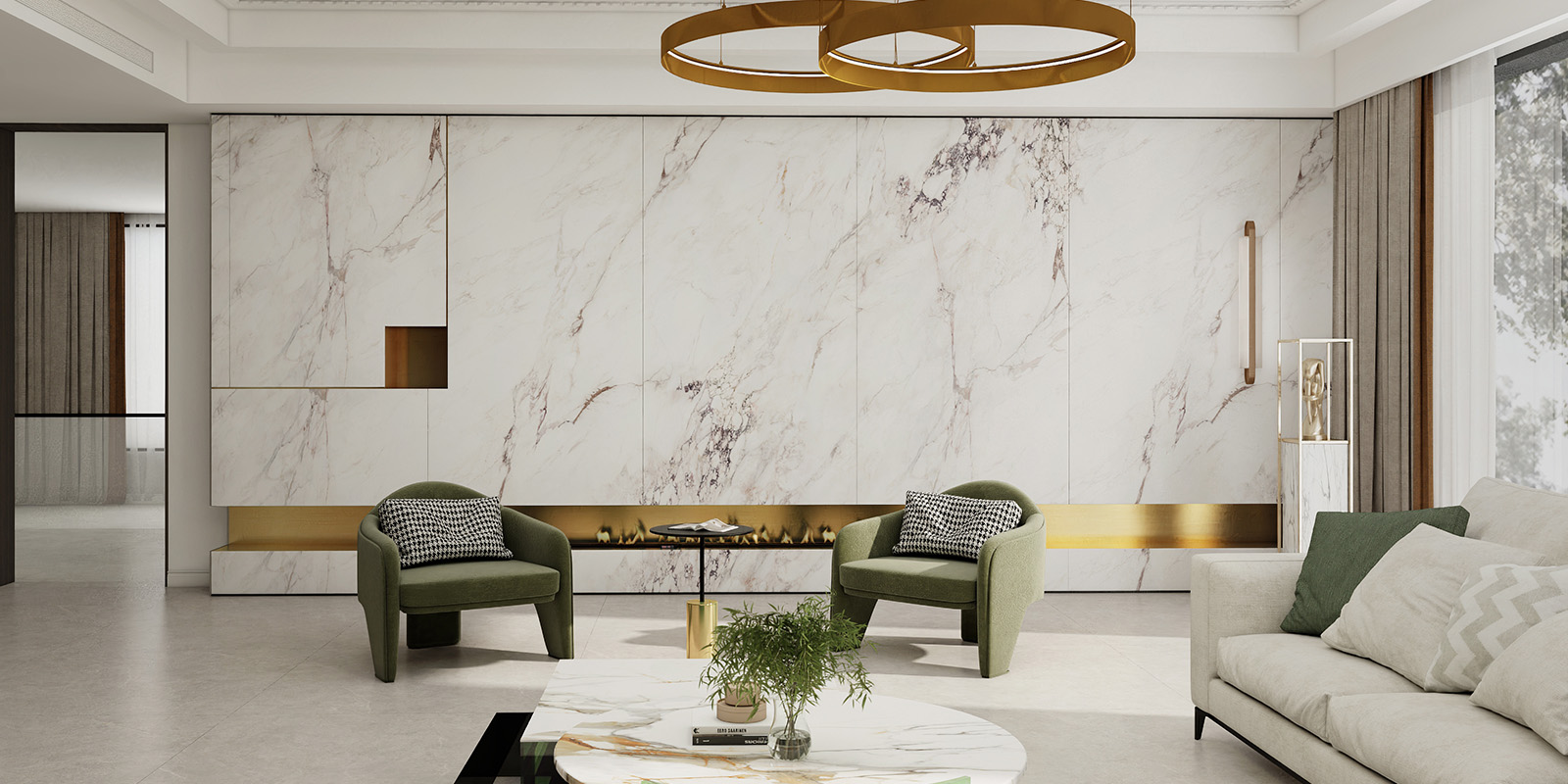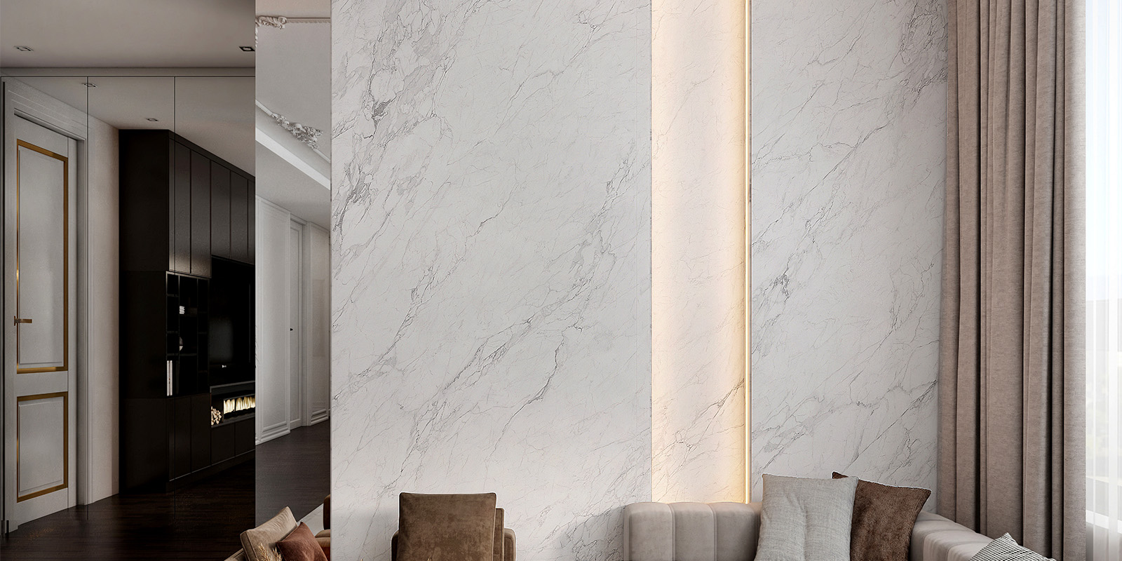 精选天然大理石材,1200X2780MM,6毫米厚度,数码精雕和柔雅微光工艺,一片到顶,适用空间广